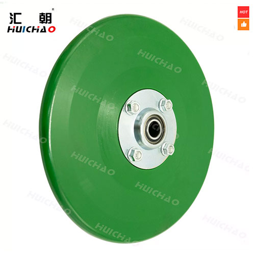 Durable 10×1 inch V8-shaped firming wheel assembly featuring a cast iron rim and polyurethane tire. Equipped with a 5203RYY2 double-row ball bearing, designed for no-till air seeders, seed drills, and grain seeders to provide consistent soil firming and precise seed placement.